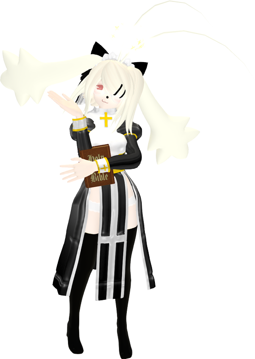 She was sculpted from a soft, incredibly pure form of wheeled cheese. The touch of her divine creators imbued her with magical preservative qualities. Legend says that a mere prick of her whiskers can cleanse any earthen impurity. St. Neo DX primarily spends her time traversing unfamiliar lands and collecting souvenirs. On her busier days, she serves as the warden of HOLYHOLYBELL and grants blessings to passersby. OUTFITS
